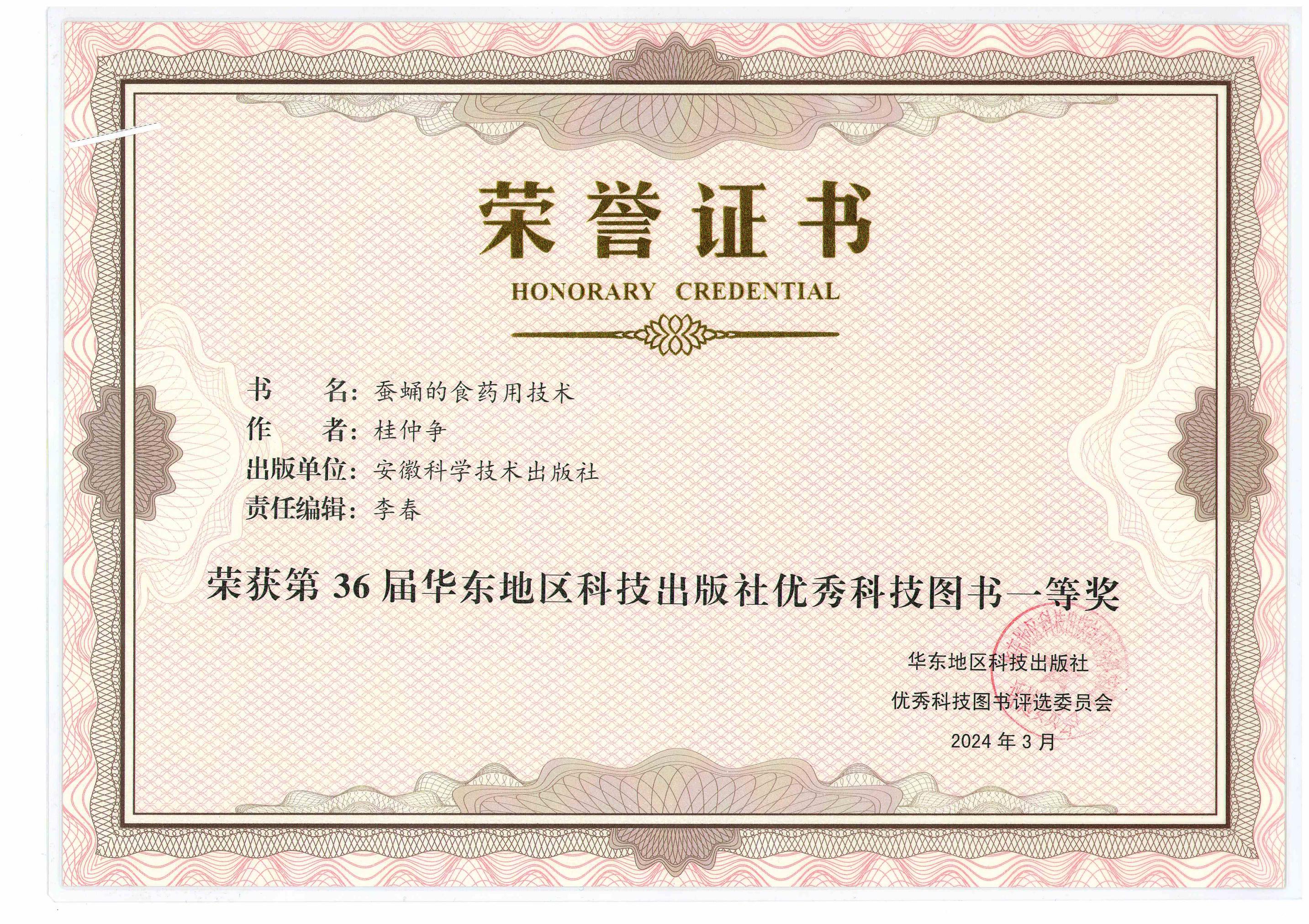 我院桂仲争研究员专著《蚕蛹的食药用技术》荣获第36届华东地区科技出版社优秀科技图书一等奖