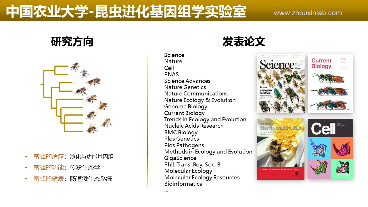 周欣教授课题组主要研究方向包括蜜蜂的进化生物学、基因组学、资源保护和传粉服务等。相关研究以演化生物学为框架,使用基因组学、宏基因组学方法理解生物多样性及生态网络的构成、互作及动态变化机制。重点研究对象包括蜜蜂的演化、传粉网络,以及以蜜蜂-肠道微生物为模式系统的宿主-肠道互作模型等。建立了基于转录组和全基因组级别同源基因构建昆虫系统发育关系的方法,构建了目前最大规模的昆虫高级阶元系统关系、重估了昆虫的关键演化时间;优化了分子分类学方法和基于高通量测序技术的混合生物样品的分子鉴定方法,用于构建蜜蜂的传粉网络、食性和群落多样性组成。