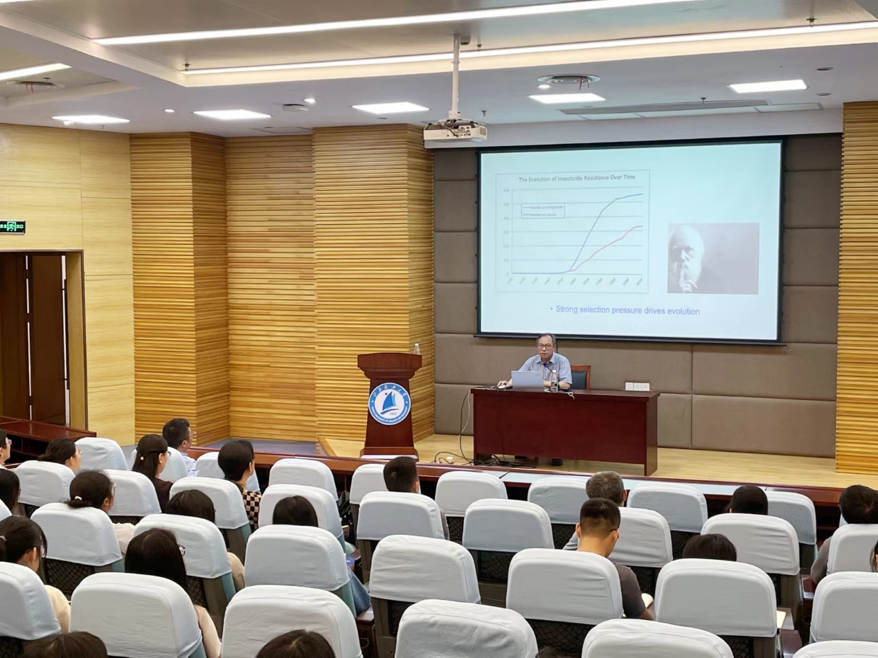 吴益东教授长期从事农业害虫抗药性研究,在本次报告中,吴教授首先回答了什么是抗药性,以及抗药性的检测方式和检测机理。紧接着,吴教授通过对两种全球性害虫棉铃虫和甜菜夜蛾CYP9A亚家族P450基因离体和活体功能的系统解析,利用遗传定位鉴定新型抗药性基因、遗传操作明确抗药性基因功能、CRISPR-Cas9基因编辑技术揭示了昆虫P450基因介导寄生植物适应性和抗药性进化的内在机制。在最后的问答环节中,吴教授结合自身经验进一步分享了如何高效筛选和定位目的基因,并为所院师生提供了参考性建议。