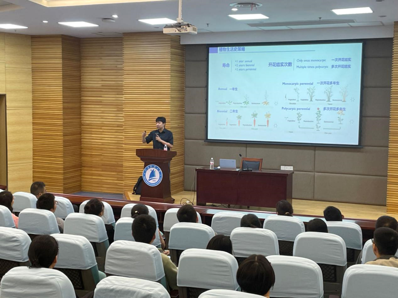 王佳伟研究员主要从事植物发育生物学研究,在植物年龄与再生领域开展了系统性研究,在本次报告中主要介绍了植物在不同环境条件下的生命周期和繁殖策略,以十字花科植物为模式,研究植物短命与长寿的遗传学和分子生物学基础。首先,王佳伟研究员向同学们介绍了短命一年生植物——杂草碎米荠,提出了人类活动如何驱动短命杂草产生的问题,并分享了关键基因FLC和CRY2调控短命一年生植物丢失春化敏感性和光周期敏感性的遗传学基础;随后,王佳伟研究员向同学们介绍了多年生模式植物——弯曲碎米荠、喜马拉雅须弥芥以及内华达糖芥,提出理解了植物死亡的原因也就理解了长寿的观点,并分享了三个FLC类基因控制多次开花多年生生活习性的相关研究;最后,王佳伟研究员进一步介绍了植物实现多年生的基本策略以及今后的研究方向,指出多年生木本植物可能具有一套独特的机制防止突变的积累。