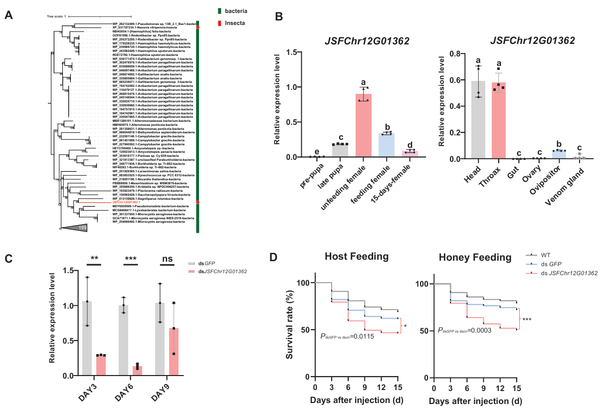本研究进一步挖掘了桑蟥聚瘤姬蜂中快速进化的毒液蛋白相关家族、免疫抑制基因家族和解毒酶家族,初步揭示了该蜂外寄生习性形成的分子机制。同时,还鉴定出桑蟥聚瘤姬蜂中发生的基因水平转移事件,并针对水平转移基因JSFChr12G01362进行了RNAi,当该基因表达被抑制后,出现了明显的死亡率上升的情况,从而揭示了基因水平转移对桑蟥聚瘤姬蜂生长发育过程的重要性(图5)。