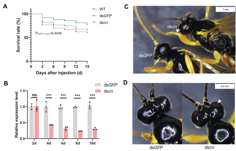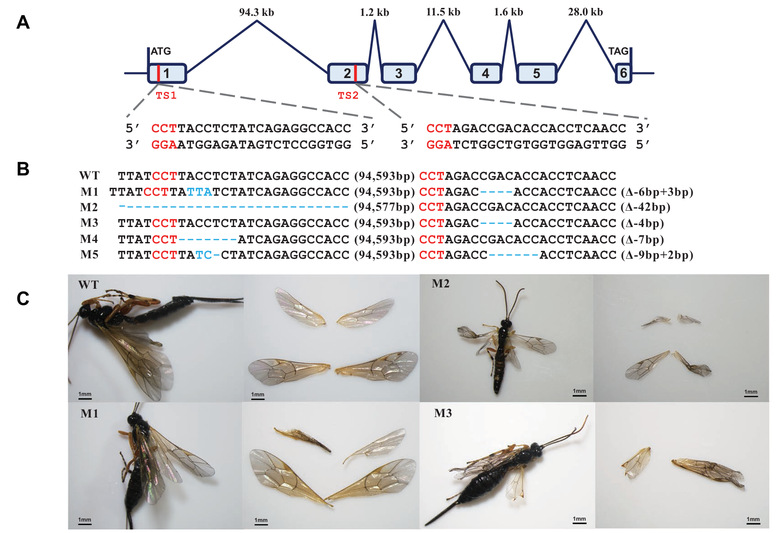 接下来,研究使用RNAi和CRISPR/Cas9等技术针对桑蟥聚瘤姬蜂的多个基因进行遗传操作。RNAi结果显示对桑蟥聚瘤姬蜂幼虫期进行cinnabar基因干扰能显著抑制80%的基因表达量,且能持续10天以上,并在成虫期能够直接观察到眼色转红的现象(图3)。此外,进行CRISPR/Cas9介导的胚胎期vestigial基因敲除后,能够在成虫期检测到翅膀发育异常等经典缺失表型(图4)。