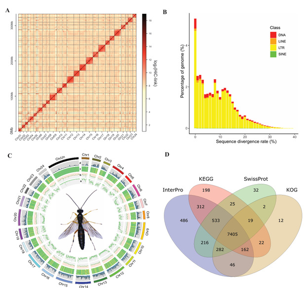 桑树在生长周期内极易遭受桑螟、桑蟥等多种害虫的为害,考虑到家蚕农药中毒、害虫抗药性和桑园环境污染等日趋严重的问题,以寄生蜂为代表的害虫绿色防治手段正不断受到重视。桑蟥聚瘤姬蜂G. kuwanae属膜翅目Hymenoptera 姬蜂科Ichneumonidae,是桑蟥、桑螟等桑树重大害虫以及二化螟等大宗作物鳞翅目害虫的优势寄生性天敌,极具生防开发潜力。本研究开展了桑蟥聚瘤姬蜂染色体水平的基因组测序(图2),共组装到24条染色体,注释出11,292个蛋白编码基因。